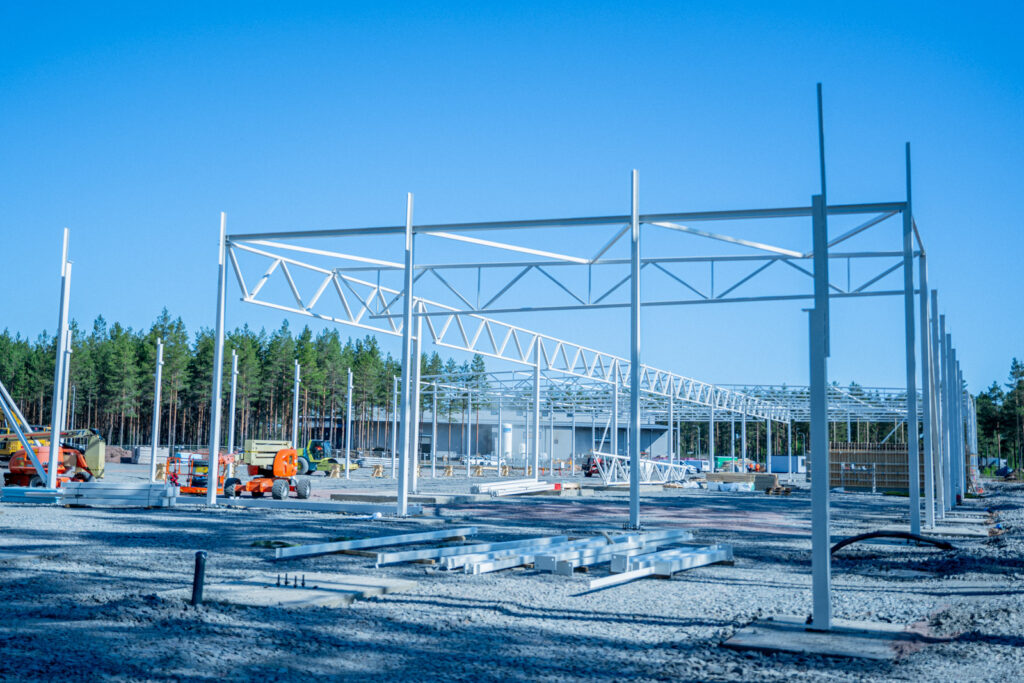Kantavat teräsrakenteet, teräsportaat, kaiteet, katokset, hallien rungot ja hissikuilut.